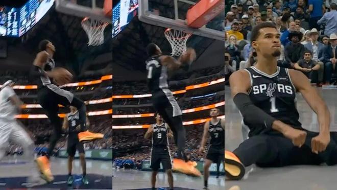 ——第四节剩下8分钟前,文班亚马抢下篮板,控球到前场,左手运球强突浓眉,然后隔着浓眉就是一记暴扣